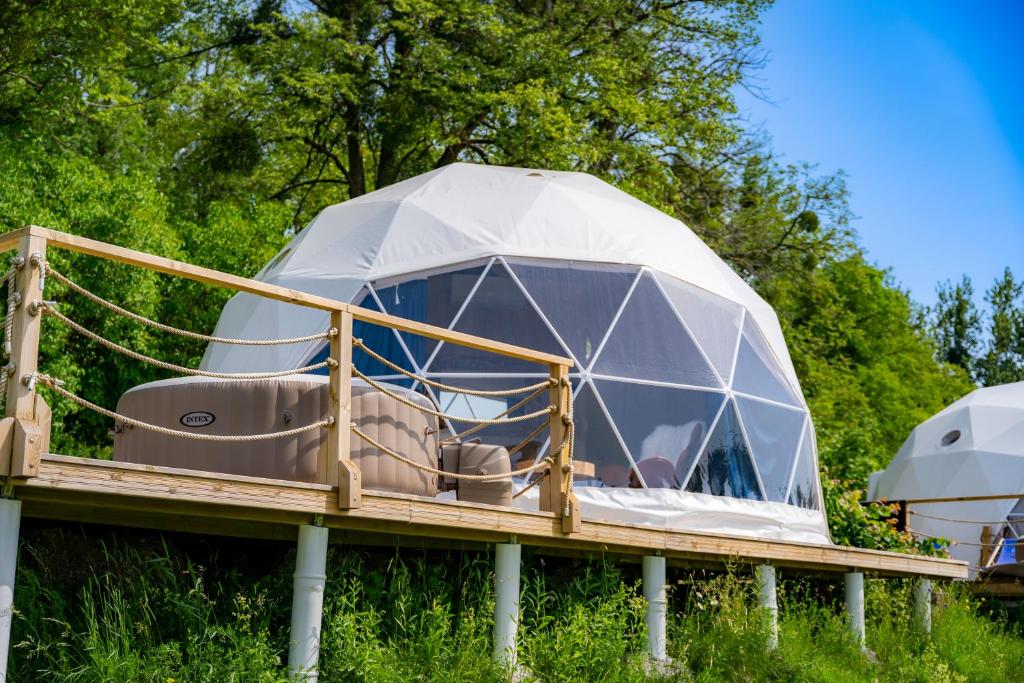 Lake Glamp Mikołajki — це оригінальні котеджі з куполами-глэмпінгами, розташовані на тропі Великих Мазурських озер. У кожній палатці є велике вікно з прекрасним видом на близьке озеро Талти. Можна любувати заходи сонця і мальовничі пейзажі, не покидая палатки і навіть ліжка. Завдяки цьому можна провести найчудовіші вихідні на озері, яке тільки існує.